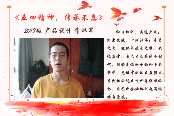 为弘扬五四精神,传播青春正能量,营造向青年榜样学习的良好氛围,5月3日,在五四青年节来临之际,设计艺术学院团委组织开展了“五四精神,传承有我”为主题的线上演讲比赛。