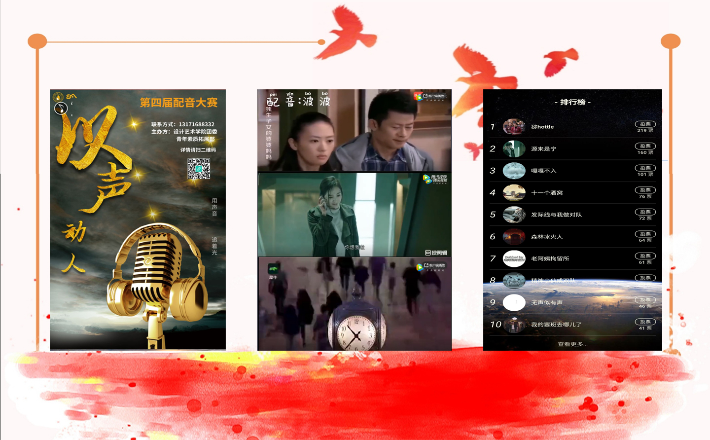 经过初选,近80名同学,26支参赛队伍进入复赛。经过了为期2个月的比拼,从海选到决赛,同学们在云端打造了“线上”艺术舞台,展示了声音的魅力。参赛队伍选材丰富,既有《流浪地球》、《逆时营救》,又有《我不是药神》、《大鱼海棠》。经过网络投票和评委打分,最终评选出一等奖一名,二等奖二名,三等奖三名,优秀奖四名。配音大赛是设计艺术学院丰富多彩的第二课堂活动之一,希望通过活动,调动同学们语言学习的积极性,提升综合素质。