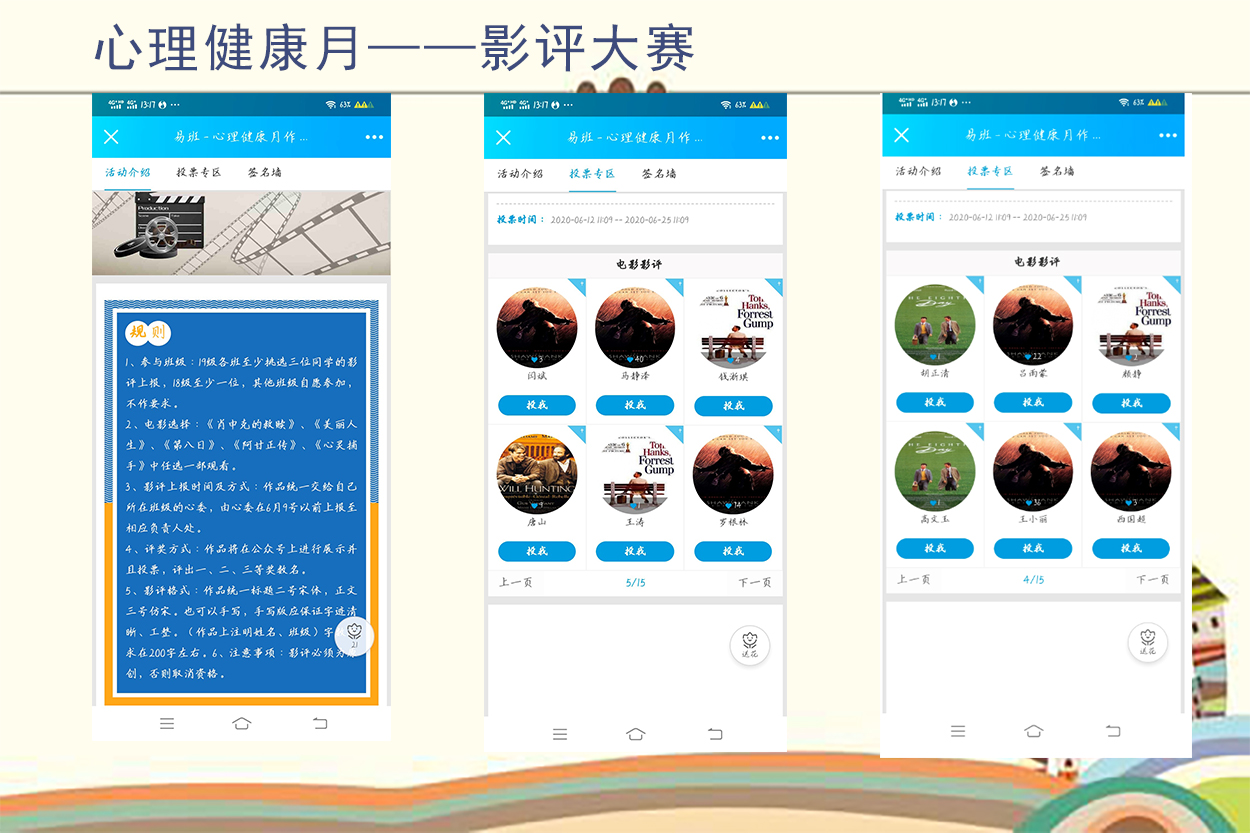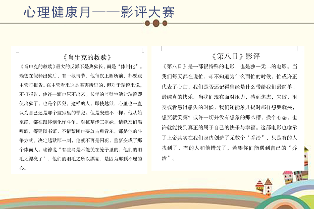 真正的心理电影拥有强大的治愈功能,因此辅导站为同学们推荐了《肖申克的救赎》、《美丽人生》、《第八日》、《阿甘正传》、《心灵捕手》等评分很较高且意义深远的电影。观看电影能够使学生站在旁观者的角度认识个体生命周期和心理发展规律,有益于进行自我探索。后期,学生通过撰写影评进行评比,评选出了一二三等奖。