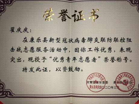 (翟庆庆在防疫工作中获得的“优秀青年志愿者”荣誉证书