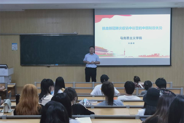 7月8日晚,马克思主义学院汪毅刚老师在琢玉楼109教室开展了题为《抗击新冠肺炎疫情中彰显的中国制度优势》专题讲座。汪老师从“中国制度”引入,讲解了青年马克思者的担当和使命,并结合疫情,详细阐述了中国特色社会主义制度的优越性。