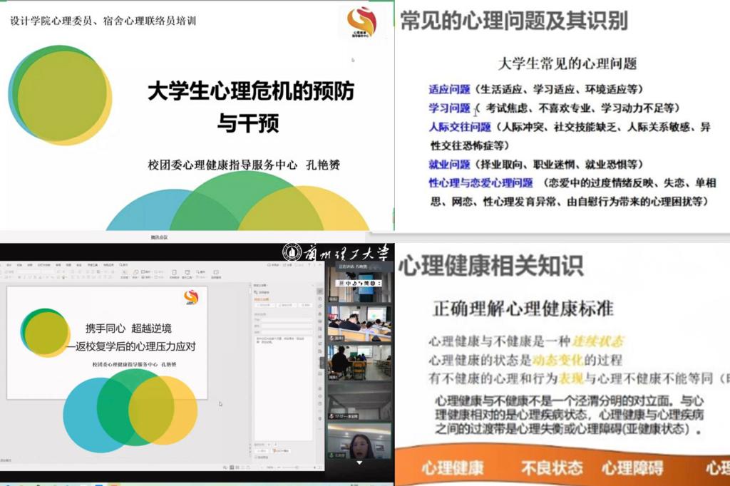 整个培训共有四讲。一是返校复学后的学生心理压力调试,主要讲述大学生复校后产生心理健康问题的原因和解决办法展开;二是大学生心理危机的预防和干预;三是大学生常见心理问题的识别,如何甄别心理问题异常等情况;四是心理委员的工作职责和助人技巧。通过培训,心理委员和心里联络员对自己的工作有了进一步的认识,也掌握了更多的工作方法。