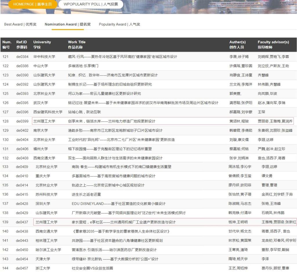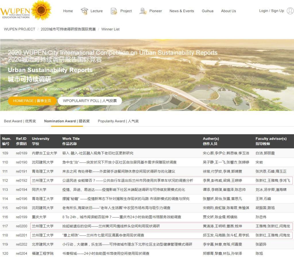 近日,2020年WUPENiCity国际竞赛公布获奖名单,设计学院城乡规划系取得佳绩,在城市可持续调研报告和城市设计作业两个竞赛单元共获得提名奖5项,这是该专业近年参加学科专业竞赛单次获奖数量最多的一次,也在西安以西地区高校中获奖最多。在城市可持续调研报告竞赛单元,由张新红、王雅梅等老师指导,李昊、王婷婷、黄涛涛、王明明、邱玉发、马海鹏等同学提交的《公退民进,安能替否?》、《拾起被遗忘的空间》、《“塞上明珠”》3份作业荣获提名奖。在城市设计学生作业竞赛单元,由王雅梅、贾丽奇等老师指导,黄颂林与程骏、钱坤与王明明同学提交的《创享未来,链活水岸——兰州电力修造厂地段更新》、《家长里短,e享社区——兰州通用机械厂工业遗产更新改造与设计》2份作业荣获提名奖。