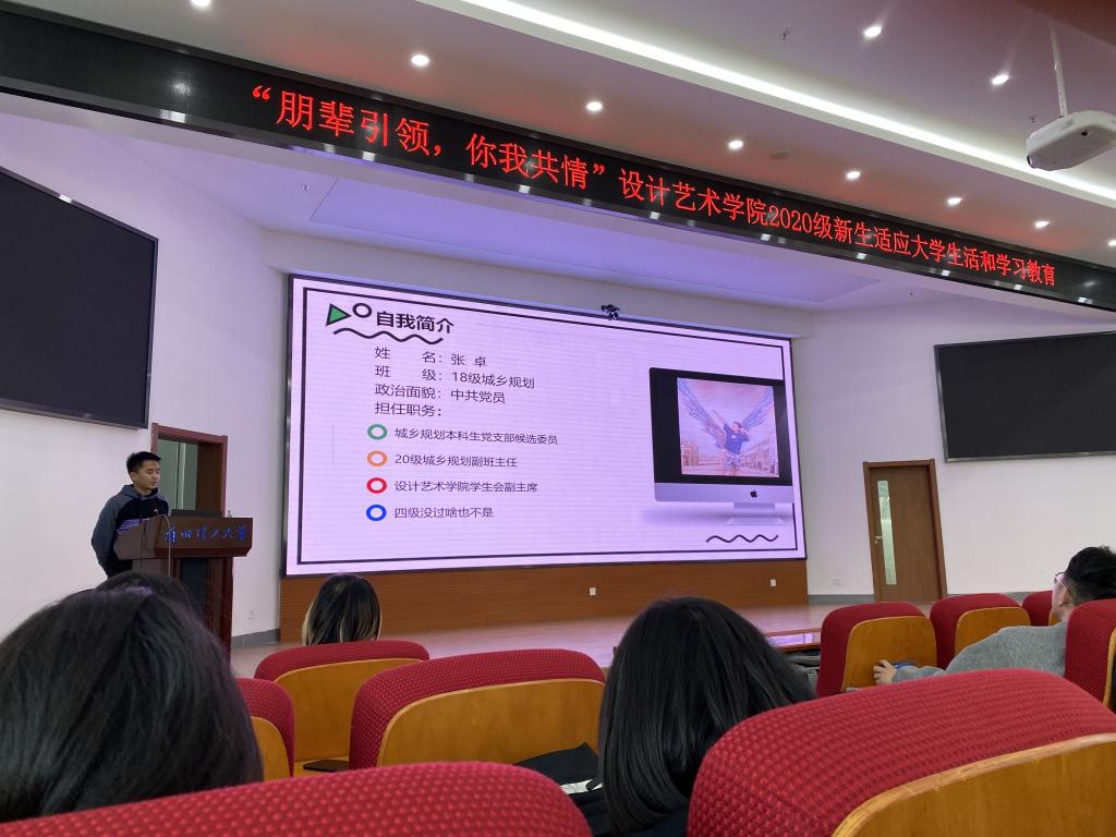 2018级环境设计专业廖洪俪同学、城乡规划专业张卓同学,2017级工业设计郭晨同学、建筑学高琪同学、产品设计李苏同学依次上台进行分享。在回顾了自身的大学经历后,五位同学就学习任务、学生工作、日常生活三方面为各位同学提供了建议。最后同学们分别就各自专业的学习进行了分享和交流,让2020级新生认识并了解了各自的专业,鼓励新生多听、多问、多学,开拓自身视野、提高个人能力,尽快完成角色转变,树立正确的学习目标,合理规划大学生活。