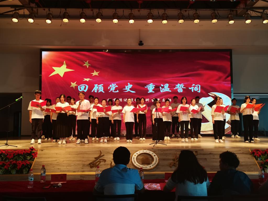随着《义勇军进行曲》旋律的响起,在场所有人自豪地唱起国歌。礼毕之后进入第二项,由学院党委书记吴学楷领誓,新党员入党宣誓、老党员重温入党誓词,同学们带着炙热的爱国爱党之心郑重宣誓,深情地表达对党和国家的热爱。接着一段开篇视频《你看啊!尘埃岂能掩芳华》回溯了中国共产党100年来筚路蓝缕、不畏牺牲、艰难探索。各党支部将一首首《我宣誓》歌曲与诗歌、情景演绎相结合,表达出了对中国共产党的无限深情。无论是“拥护党的纲领”“遵守党的章程”“执行党的决定”“严守党的纪律”,还是“为共产主义奋斗终身”“永不叛党”等,当誓词伴随着激昂的旋律,在广大党员中一次次唱响,同样是一次次的鞭策与提醒。它提醒着广大党员自觉履行党员的义务,提醒着广大党员主动肩负起新时代责任与历史使命。