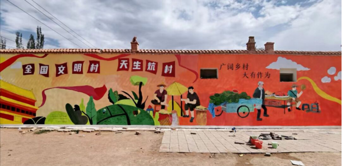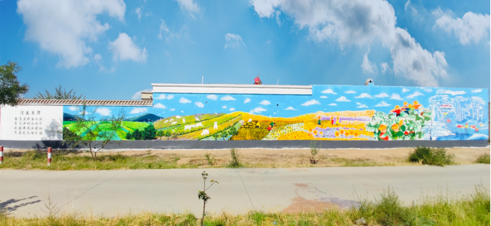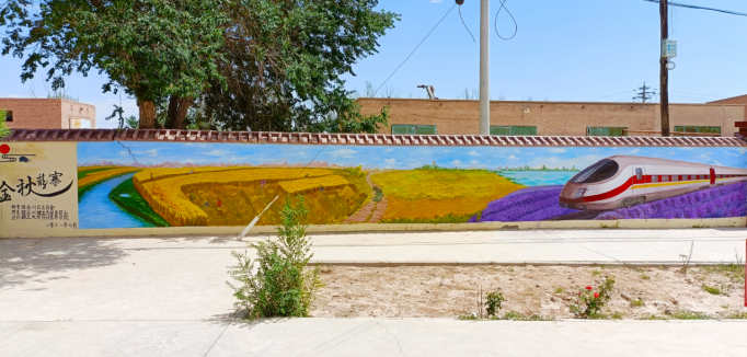 河西走廊地区七月的每天都是炎炎烈日,紫外线强到让人难以忍受,气温最高时竟有三十八度,时而也出现漫天黄沙的沙尘暴和阴雨阵雨等恶劣天气。团队中有部分学生来自南方,有些同学极不适应当地的干燥的气候条件,但无论如何,同学们心中始终惦念着要圆满完成任务,始终没有停下手中的画笔。各小组成员以浓厚的爱国情怀和坚定不移的精神穿行在祖国镍都金昌的各村镇中,为振兴乡村挥洒着汗水。经过为期一周的努力,墙绘工作圆满结束。画笔丹青绘制的不仅是美丽乡村的图景,更是同学们挥汗如雨的艰辛;景观营造的不仅是美好人居,更是同学们心中的激情与热忱!