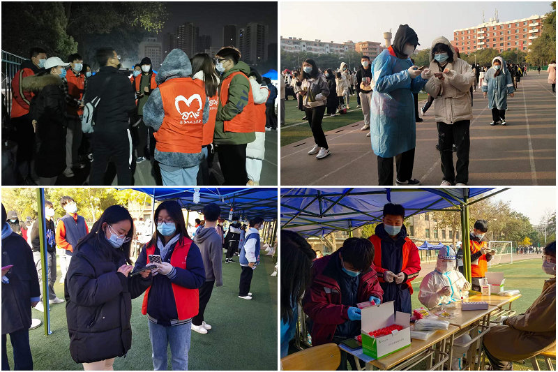 早上8点,核酸检测工作如期进行,志愿者在指定位置准备就绪,与医护人员一道投身到紧张的核酸检测工作中。“请相互间隔1m以上的距离,自觉排好队。”“您好,请配合出示一下健康码,在这里核对信息。”这些温馨的话语,传递着志愿者的真情提示。十人一组进入采样区,即采即走。志愿者们忙碌的身影,遍布核酸检测点的每个角落。在志愿者的参与下,采样工作井然有序,效率明显提高,那一抹鲜艳的“志愿橙”和“最美白”在人群中也成了一道靓丽风景。在采样现场,很多志愿者都发自内心地表示:“疫情当前,虽然不像医务人员在最前线,但身为青年志愿者,投身到抗疫行动中,为老师和同学们做一些力所能及的事情,展现新时代青年学子的担当感到非常开心和幸福。”