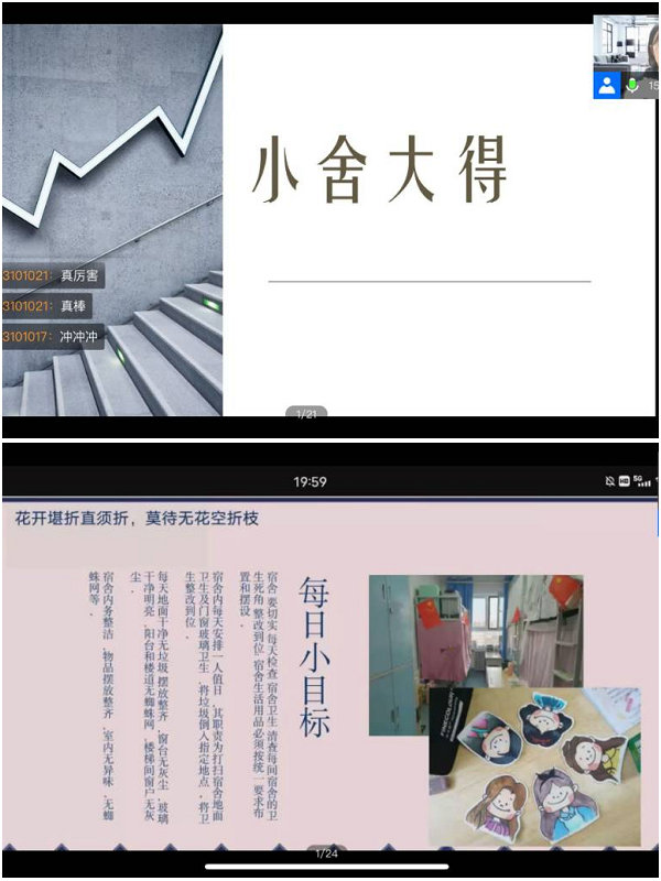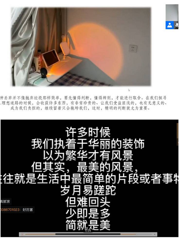 11月18日线上进行活动一审,角逐出21只决赛队伍。决赛答辩时,按照规则要求,主持人依次播放各参赛宿舍的视频,由评委进行线上打分,最终确定名次。来自不同年级的21个参赛宿舍用精彩的视频和PPT答辩向评委和观众展示了宿舍整理或简化的过程、分享宿舍前后对比、宿舍成员风采和整理和简化过程中的感悟,以独特视角展示日常学生的生活风貌。最终,由主持人公布决赛获奖名单,宣布本次比赛圆满结束。