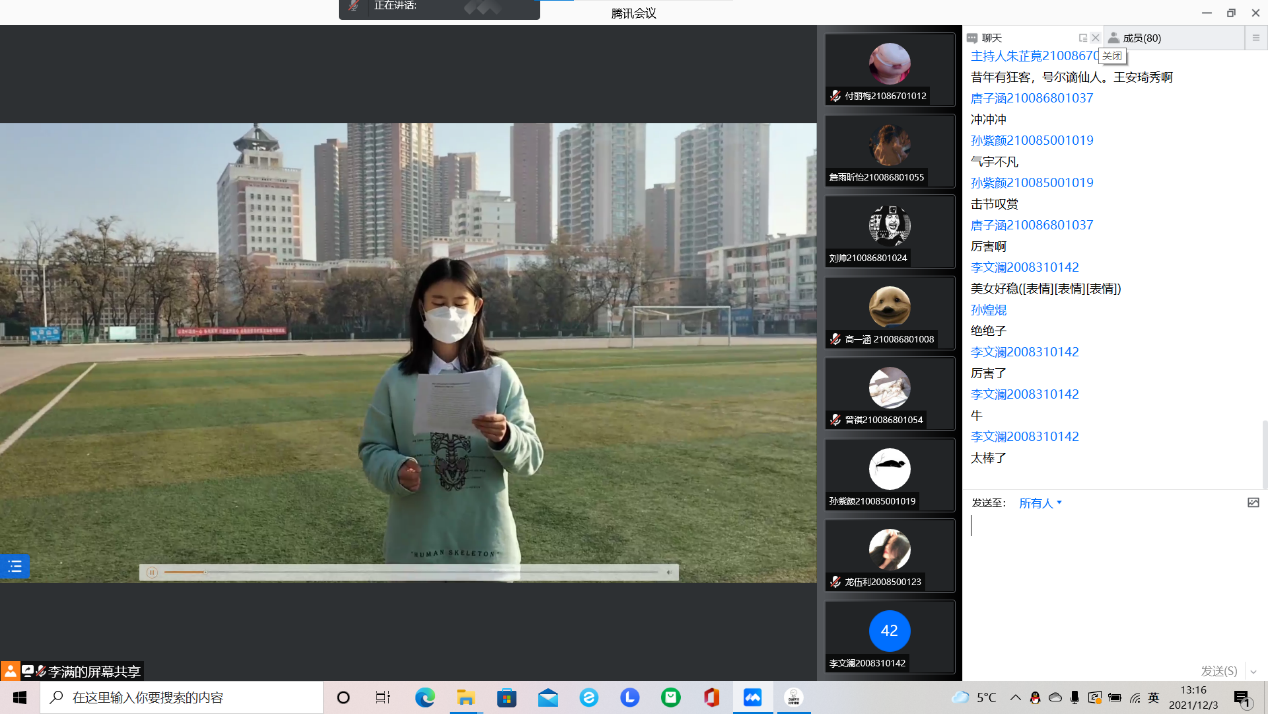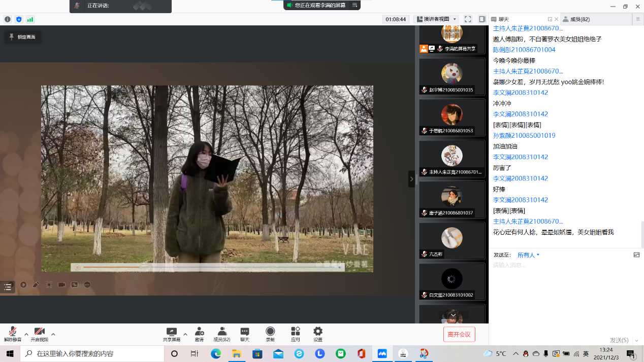 本次比赛共有来自不同年级的30名同学参加,同学们依次展示了自己精彩的视频。评委们从视频内容、人物表达等方面,进行打分。经过一审,共有25名同学进入决赛。决赛中,参赛选手们各有所长、热情洋溢、生情脉脉。精彩的演讲深深的感染了在场的每一位观众。21级视传唐子涵同学以她饱满的热情和真挚的话语表达她眼中的“工大”,引起了大家的共鸣,赢得了大家的赞许。最终唐子涵同学荣获特等奖,蔡骏,夏安淇荣获了一等奖,比赛还评选了二等奖,三等奖和优秀奖。