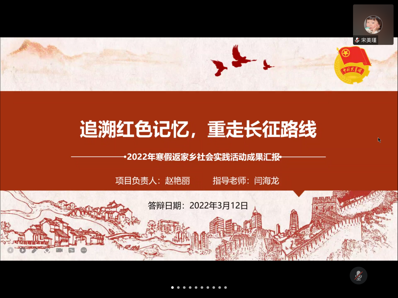 同学们结合自己的亲身经历,讲述了在社会实践活动中的所见所闻和切身感受,分享了自己在社会实践过程中收获的心得与感悟,总结了社会实践的意义和价值。赵艳丽团队以新颖的角度生动讲述了长征历史,获得了同学们的一致好评。