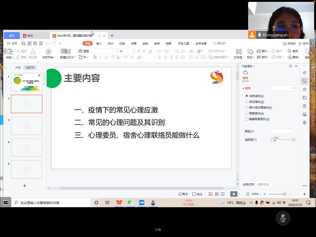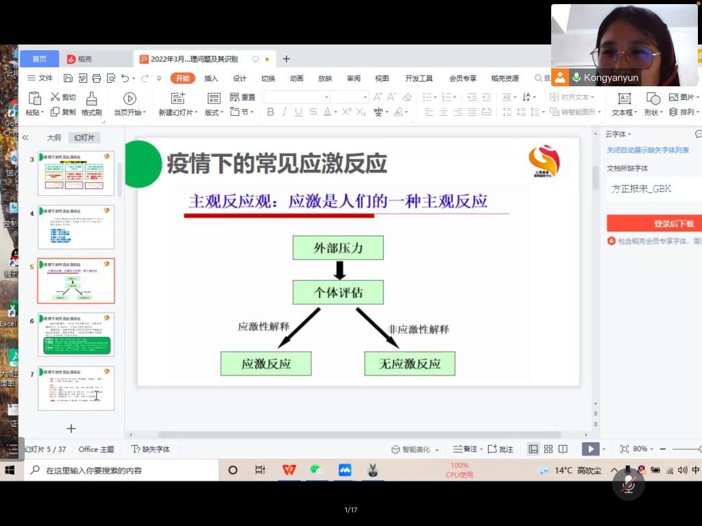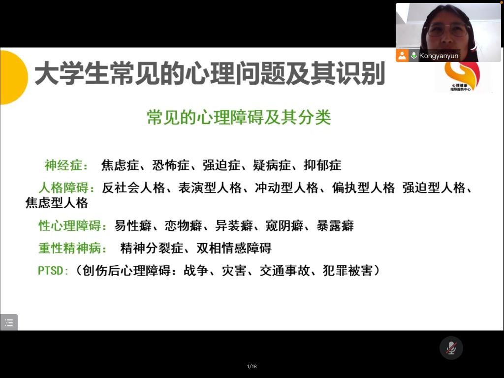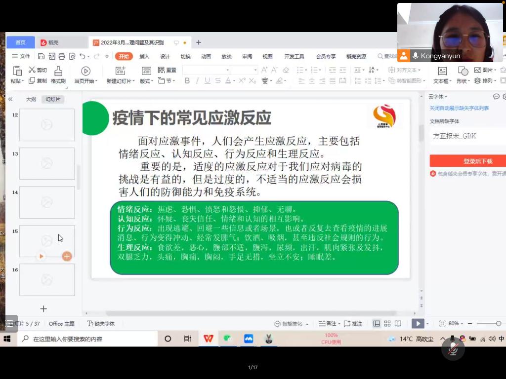 本次讲座在腾讯会议线上举行。讲座开始,校团委心理健康中心孔艳赟老师先简单地为同学们解释了何为疫情之下常见的心理应激反应,列举了九种情景及解决方法:“生活中往往会遇到一些困难的情况,都会导致人们产生心理应激反应,可以通过日记记录生活美好的时光,适当运动等方式转移注意力,舒缓心理压力,缓解心理应激反应。”