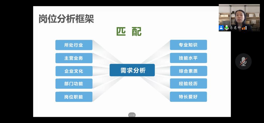 首先,马文静老师从认清形势、把握趋势、知己知彼以及从容应对四个方面分析了当前疫情影响下的就业形势,希望同学们能够准确把握大学生就业新变化,顺应变革,科学规划,理性选择。详细讲解了毕业生应如何进行目标定位以及明确目标的三步骤。其次,马文静老师建议同学们从专业知识技能、自我管理技能以及可迁移技能三方面认识自身优势和亮点,结合自身优势和岗位需求匹配适合自己的岗位。强调了简历制作的要点,即简历要体现求职者与岗位匹配的核心能力,要包含实践经历的阐述,简历的排版设计要简洁清晰。最后,马文静老师讲了求职者面试过程中常见的问题及回答技巧,常用的面试礼仪以及线上求职的注意事项。