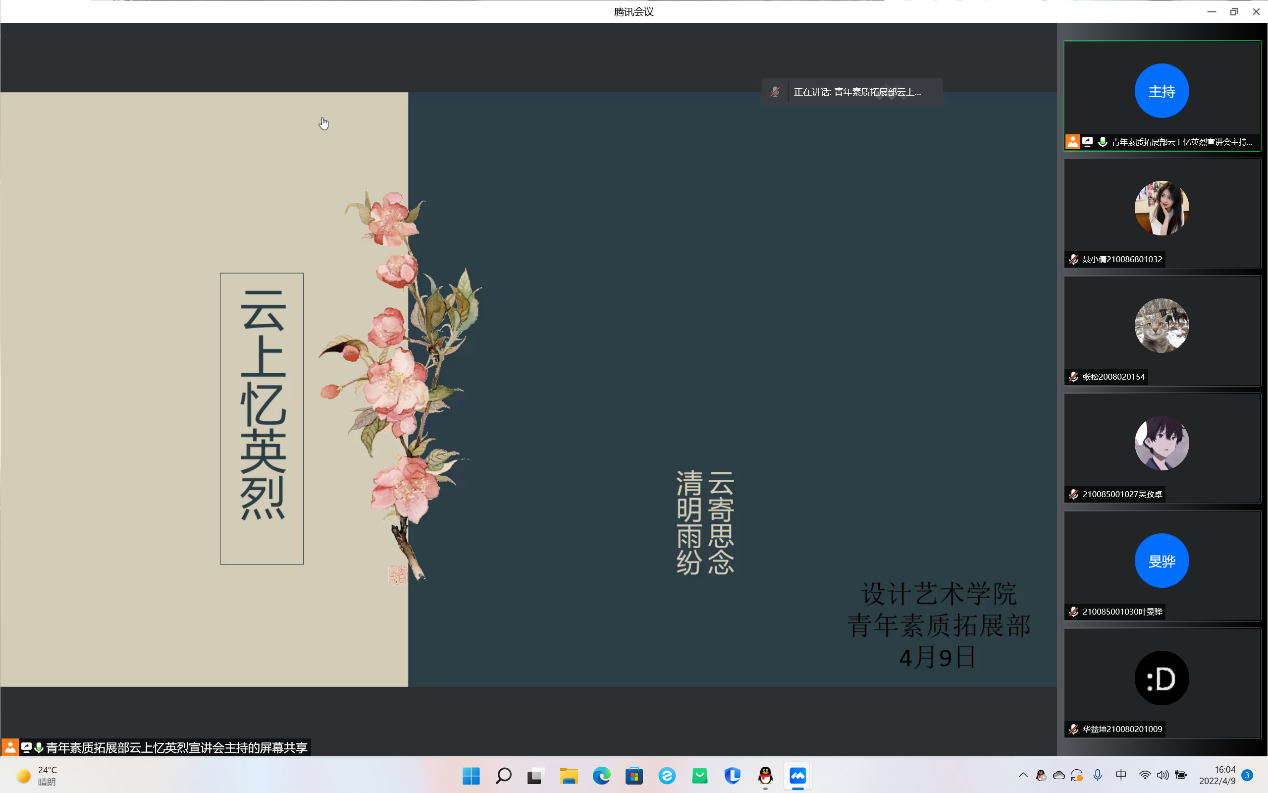 为践行五四青年精神,学习、传承英烈精神,4月9日,兰州理工大学设计艺术学院线上开展“清明雨纷 云寄思念”系列活动之“云上忆英烈”学习活动。活动通过线上会议的的方式,云上祭扫英烈,歌颂英烈,向英雄致敬。