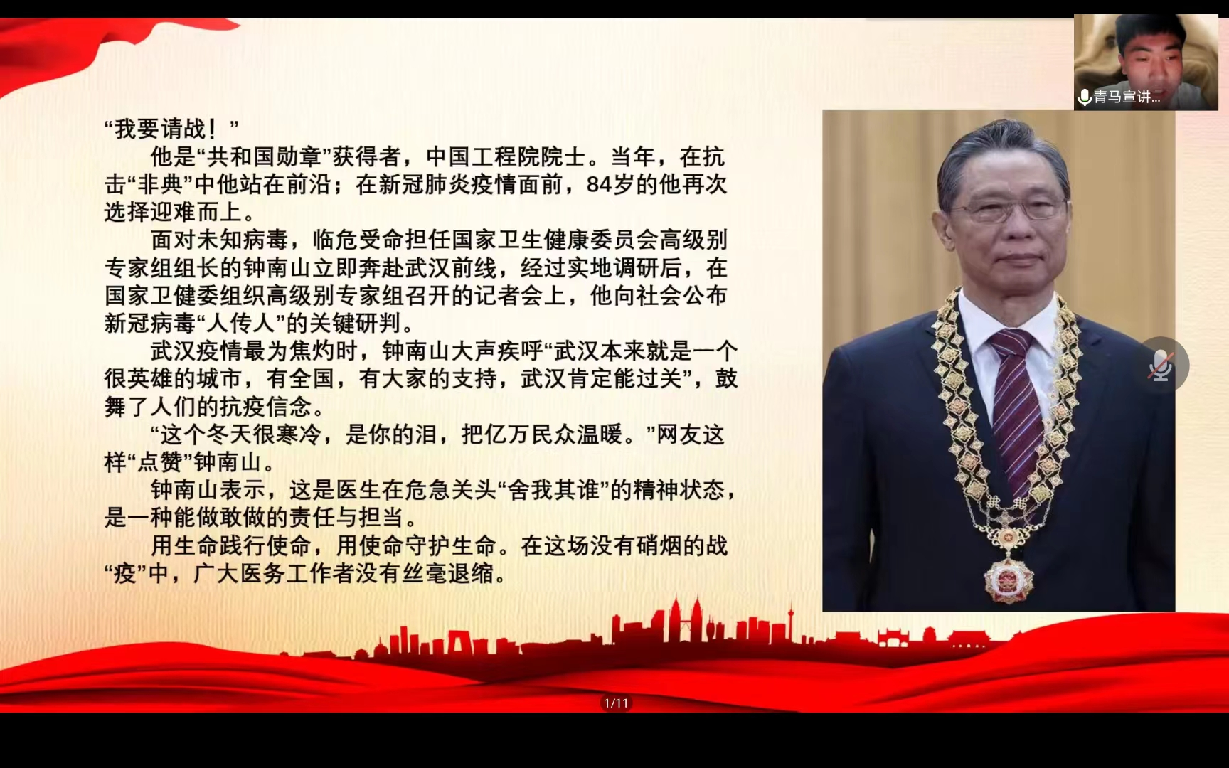 为深入贯彻学习全国两会精神、抗疫精神。4月12日,我校三名青马宣讲团成员走进设计艺术学院21级工业设计1班团支部,以线上会议的形式为同学们进行了宣讲。会上,三名“青马”宣讲团成员分别以“致敬抗疫英雄”“抗议精神”“从两会看中国新征程”为主题,结合实时政事,以钟南山、张定宇、陈薇等人民英雄为例,将这些人民英雄的伟大形象深深得刻入同学们的心中。三个抗疫故事让同学们身临其境,切身感受奋战一线医务人员们的艰辛不易,同学们对人民英雄肃然起敬。今年的中国两会被赋予特别的意义和使命。透过两会,中华民族伟大复兴,这一14亿中国人最深沉的追求,变得愈加清晰与光明。
