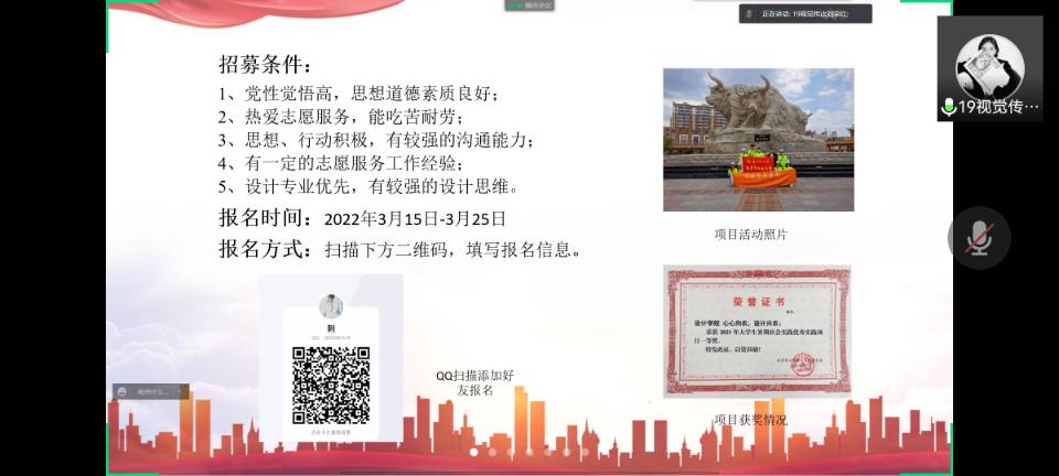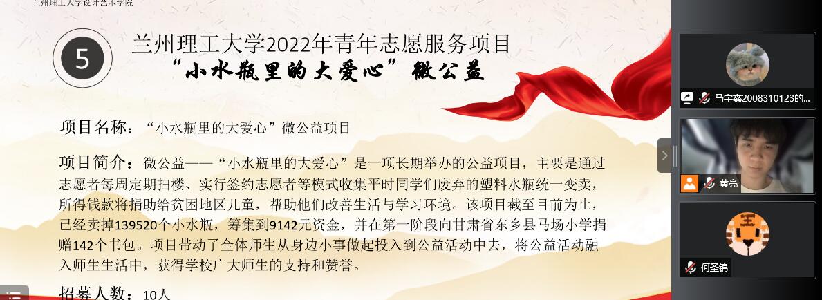 根据学校团委下发的《关于举办2022年兰州理工大学青年志愿服务项目大赛的通知》,设计艺术学院于4月12日线上组织开展“青年志愿服务项目”双选活动。此次活动面向全院同学,共有147人参加。