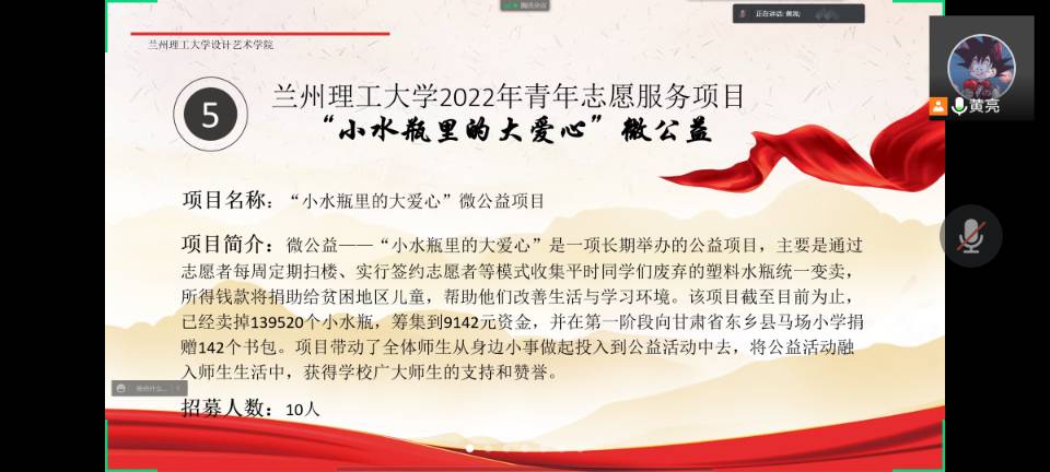 此次双选会,我院共有七个团队进行了申报。分别是:“小水瓶里的大爱心”微公益、“法治文化”针对当代大学生的普法教育志愿服务项目、共益设计——“微景观”营造助力陇上乡村振兴、应急救援与疫情防控志愿服务项目、我为家乡做点事儿——“青藏之眼 雪域明珠”天祝藏区文旅传播者、手绘乡村文化墙志愿服务项目。项目内容具体囊括法律服务、应急救援与疫情防控、乡村振兴、关爱贫困地区儿童、旅游服务及其他领域。双选会活动中,首先由各项志愿服务项目负责人对志愿项目依次进行宣讲,介绍项目背景、招募人数、招募条件、报名时间以及方式等项目内容。其次,主持人组织各项目负责人进行线上答疑环节。最后,学院团委素质拓展部的工作人员为大家再次解读了学校关于青年志愿服务项目大赛的相关注意事项。至此,双选会圆满结束。
