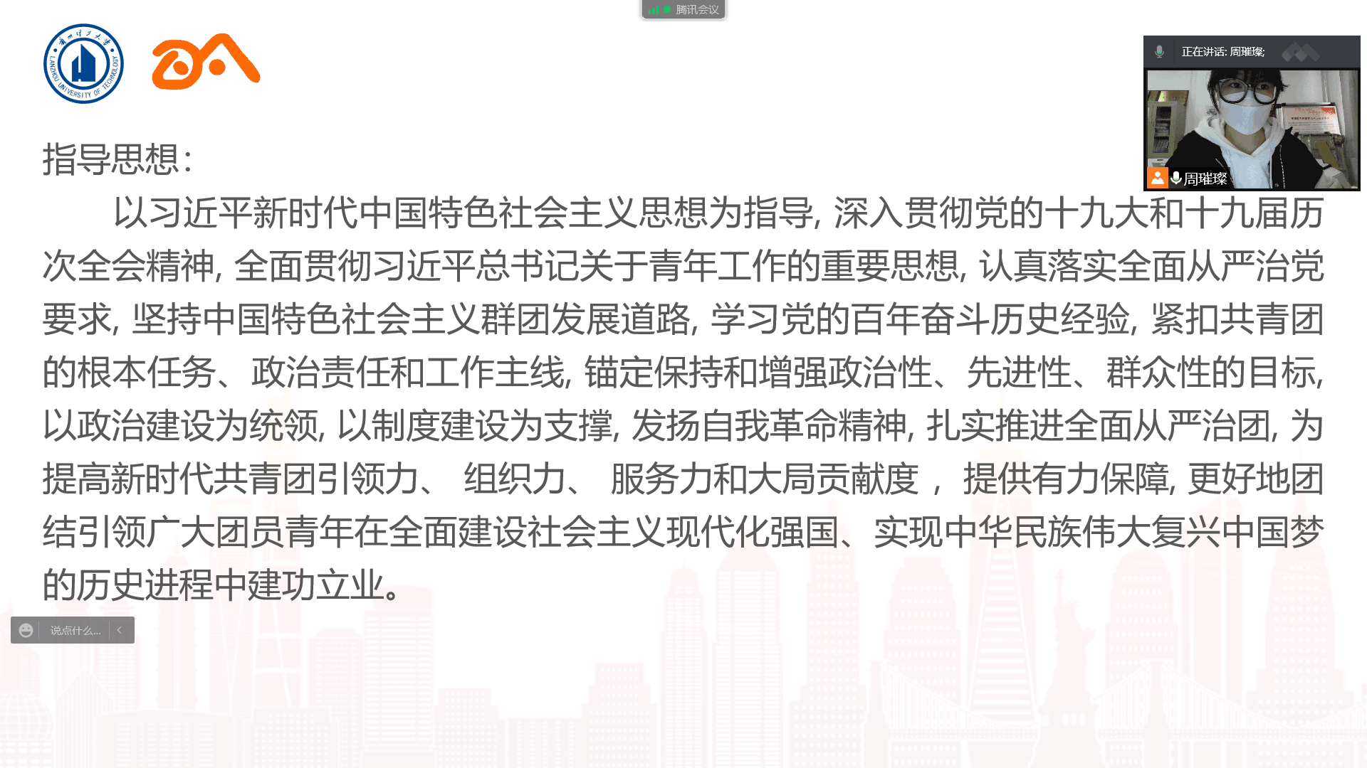 本次培训紧密结合学习宣传贯彻党的十九届六中全会精神,学习领悟党的百年奋斗重大成就和历史经验。活动中,团委学生会主席团成员周璀璨同学带领全体工作人员依次学习了《中共中央关于党的百年奋斗重大成就和历史经验的决议》、《新时代全面从严治团实施纲要》,习近平总书记关于青少年学生成长的重要要求摘录,《加强和改进新时代学联学生会工作实施方案》、《关于落实共青团和学联对高校学生会(研究生会)指导管理责任的若干规定》、《关于学联学生会工作人员改进作风,服务同学的若干规定》、《关于推动高校学生会(研究生会)深化改革的若干意见》等六项内容。