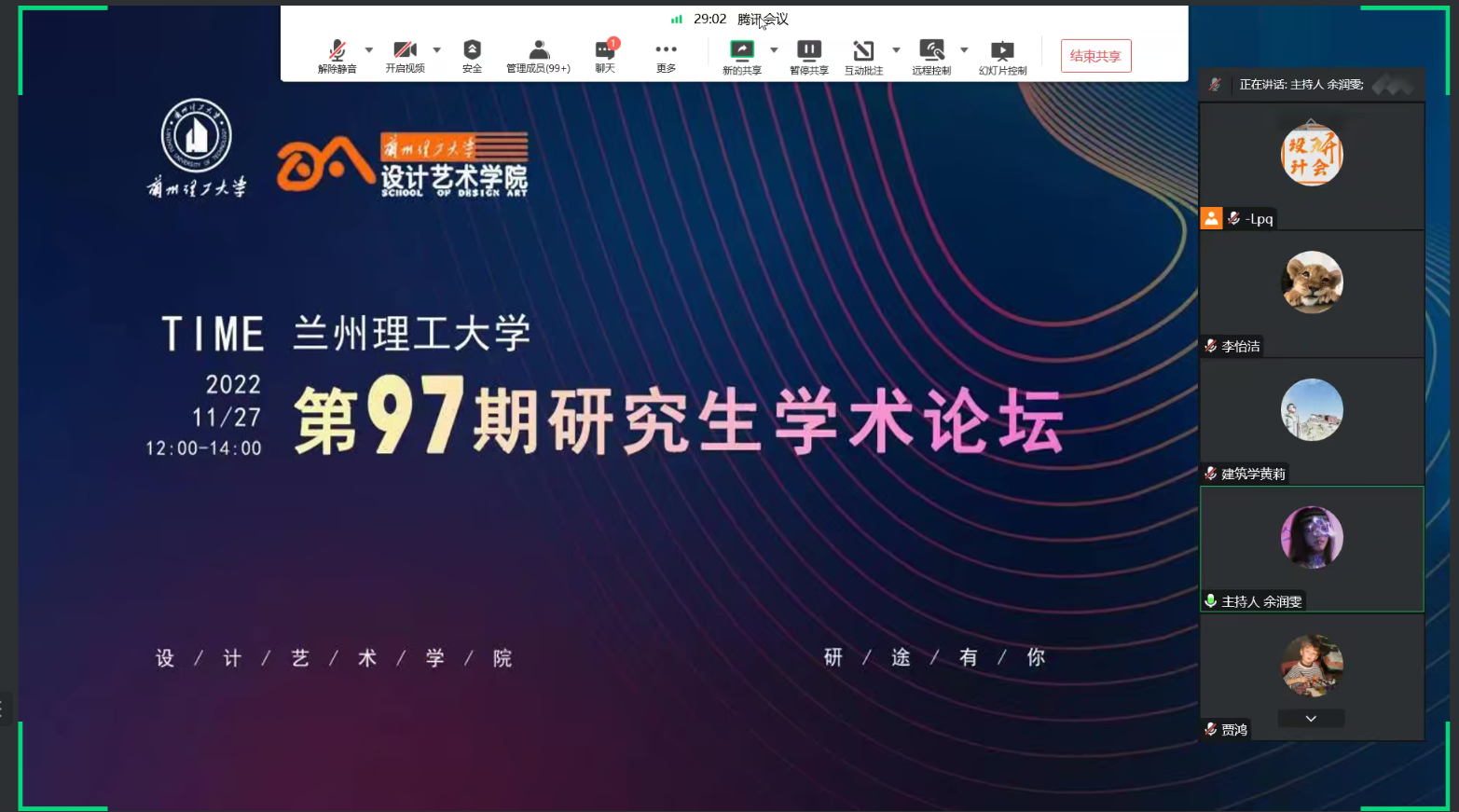 为丰富知识储备,拓宽学术视野,促进学术交流,激发研究生钻研学术的热情,启迪研究生的学术思维与创新能力,设计艺术学院于2022年11月27日中午在腾讯会议上举行第97期研究生学术论坛。研究生辅导员赵沐岩老师、优秀学生代表以及全体研一新生参加此次活动。本次活动分为分享环节和提问环节。