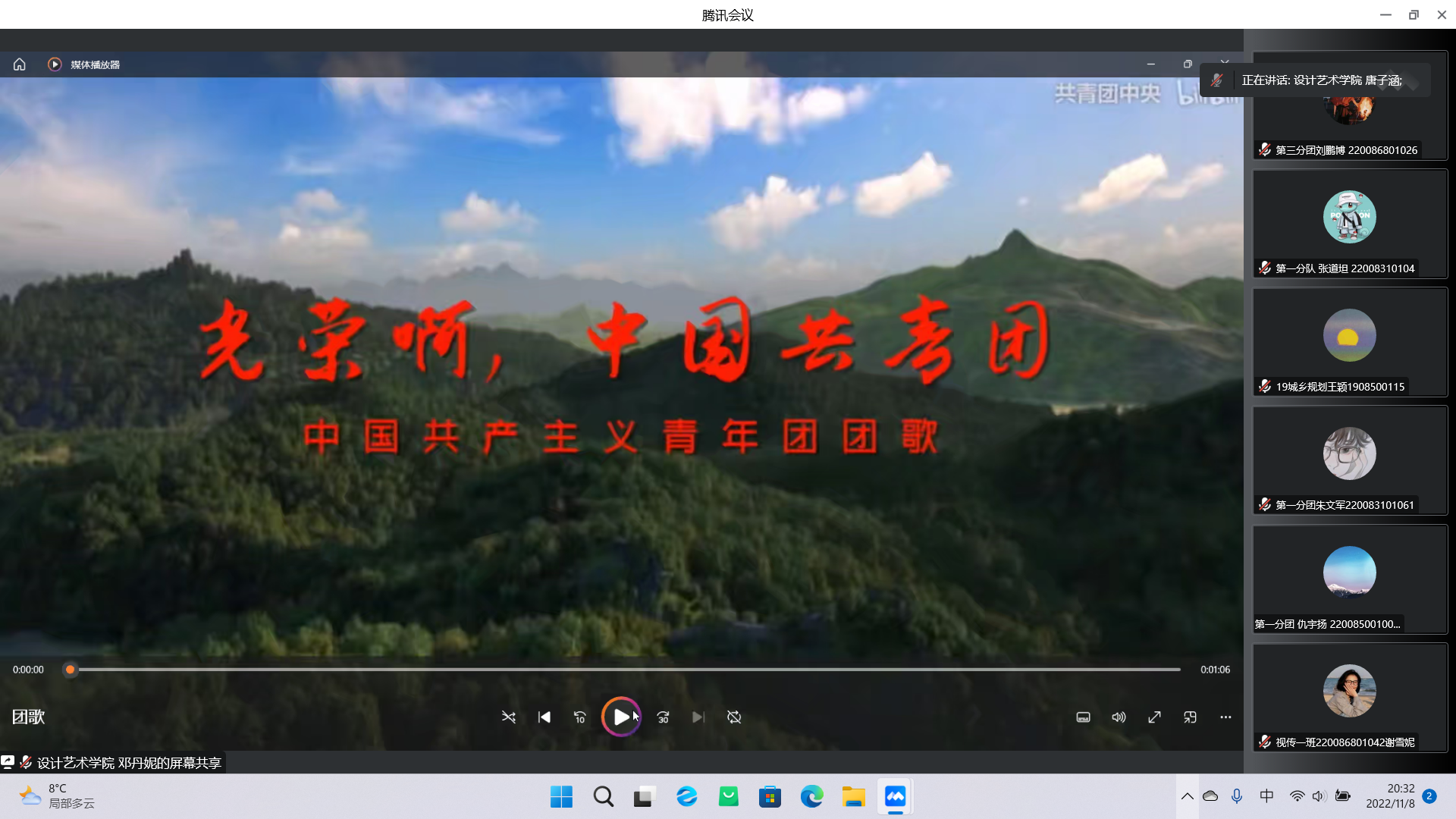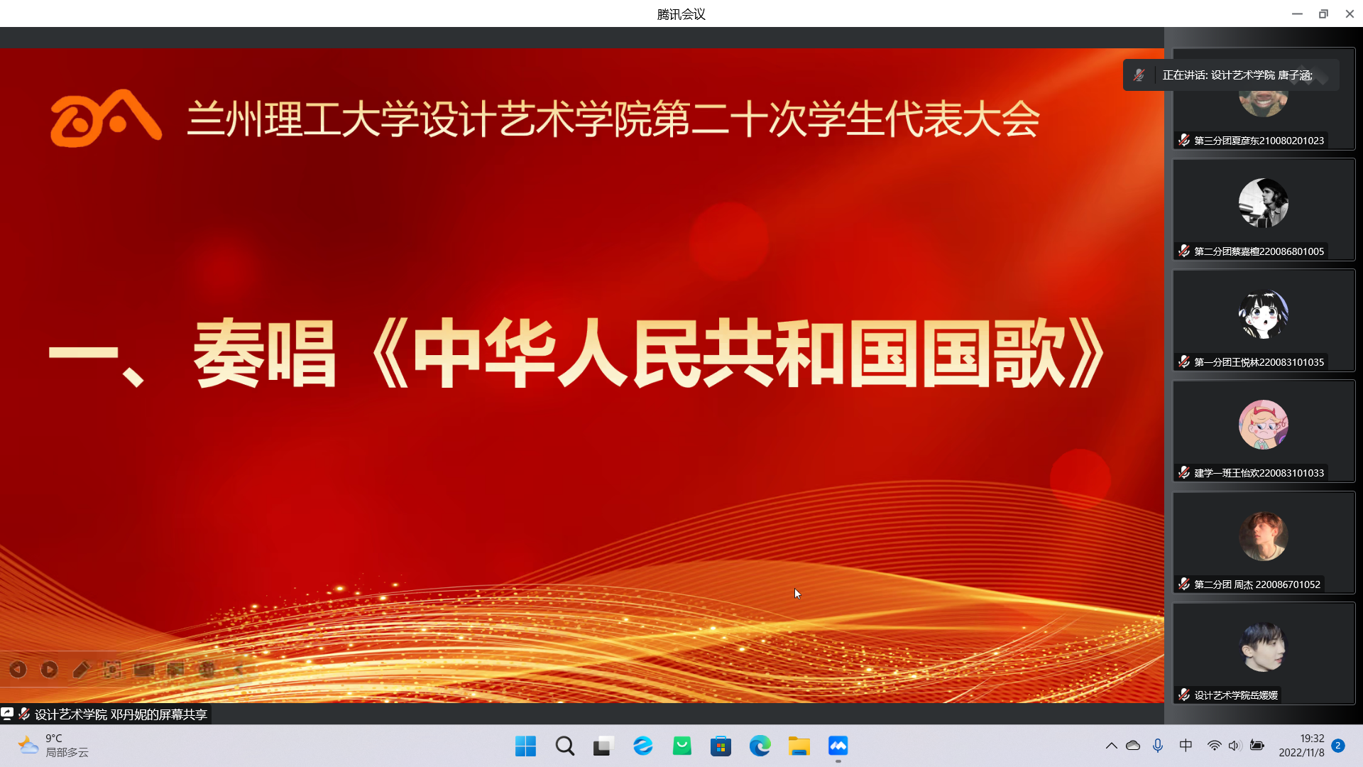 2022年11月8日,兰州理工大学设计艺术学院线上组织召开第二十次学生代表大会。参加本次学生代表大会的有:设计艺术学院团委书记宋美瑾、设计艺术学院辅导员、兰州理工大学学生会代表耿世龙同学、校学生会干部、兄弟学院学生干部以及我院全体学生代表。会议由设计艺术学院唐子涵主持。