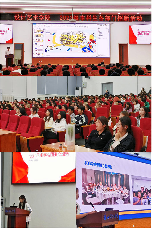 会上,宋老师对2023级新生参加本次会议表示欢迎,并鼓励同学们积极加入学院团学组织,为设计艺术学院学生工作贡献自己的一份力量。接着,学生组织各部门负责人依次播放了招新视频及PPT,并介绍了各部门职责、工作内容,帮助同学们更深入地了解学生组织各部门的主要职能与架构,让同学们根据自身的优势与兴趣来选择不同的部门。
