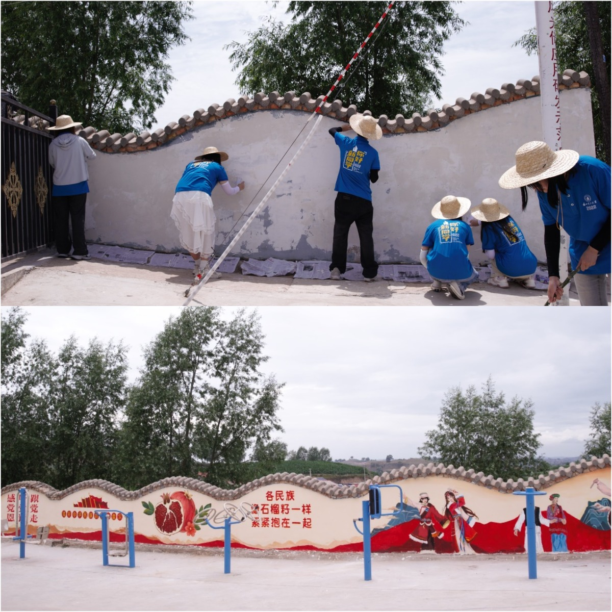 7月10至13日,设计艺术学院组织7名学生到东乡县五家乡马阴村开展暑期社会实践活动,以“铸牢中华民族共同体意识,绘就宜居宜业和美乡村新画卷”为主题,在村委会院墙上进行墙绘创作,美化乡村环境,营造特色乡村文化空间。