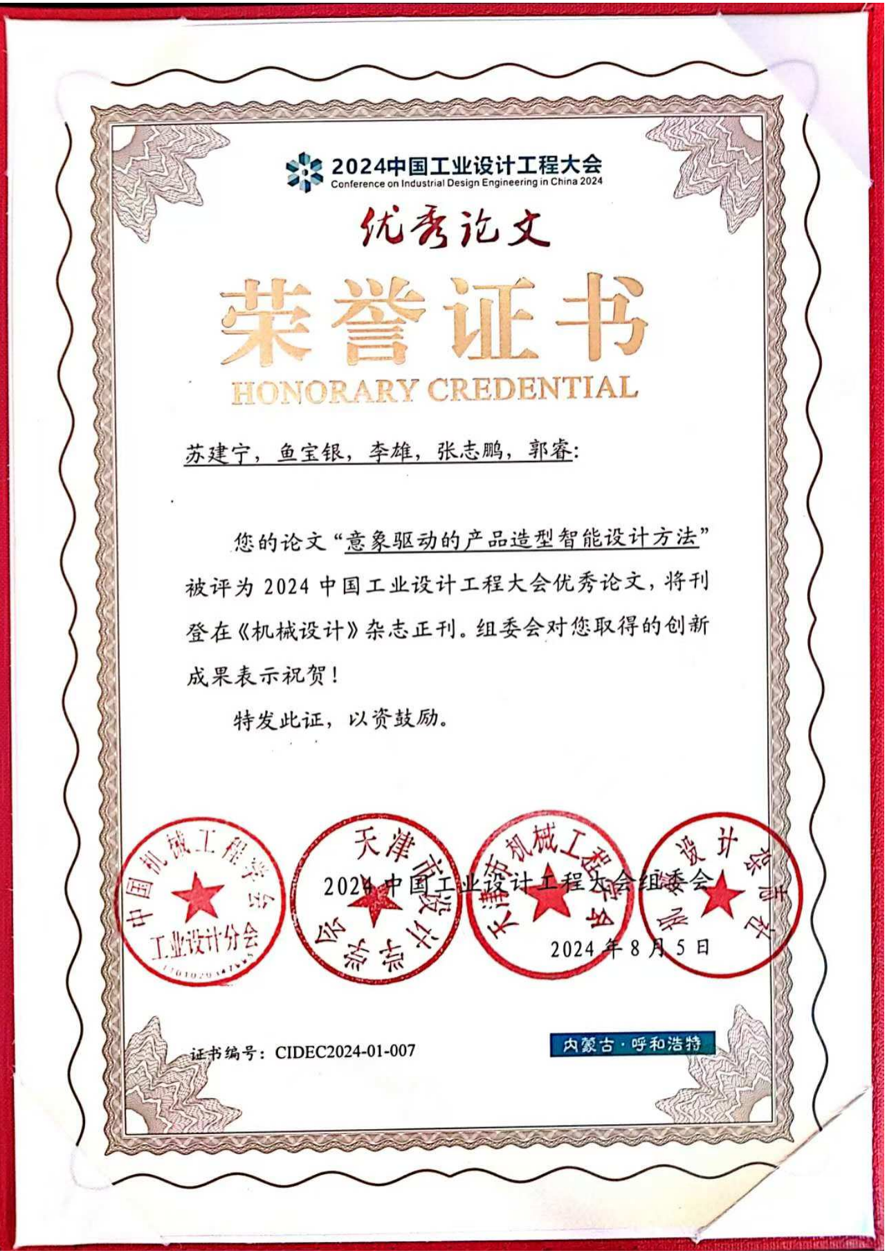 我校苏建宁教授带领团队相关人员参加了本次会议,并作大会主旨报告。团队的研究成果《意象驱动的产品造型智能设计方法》,被评为2024工业设计工程大会优秀论文。评审委员会对论文给予高度评价,认为其研究内容新颖、方法科学、应用前景良好,对推动工业设计理论与实践的深度融合具有重要意义。这一殊荣不仅是对工业设计团队科研实力的充分肯定,也是我校在该领域研究水平与学科影响力的重要体现。(撰稿:杨文瑾;终审:余勇)