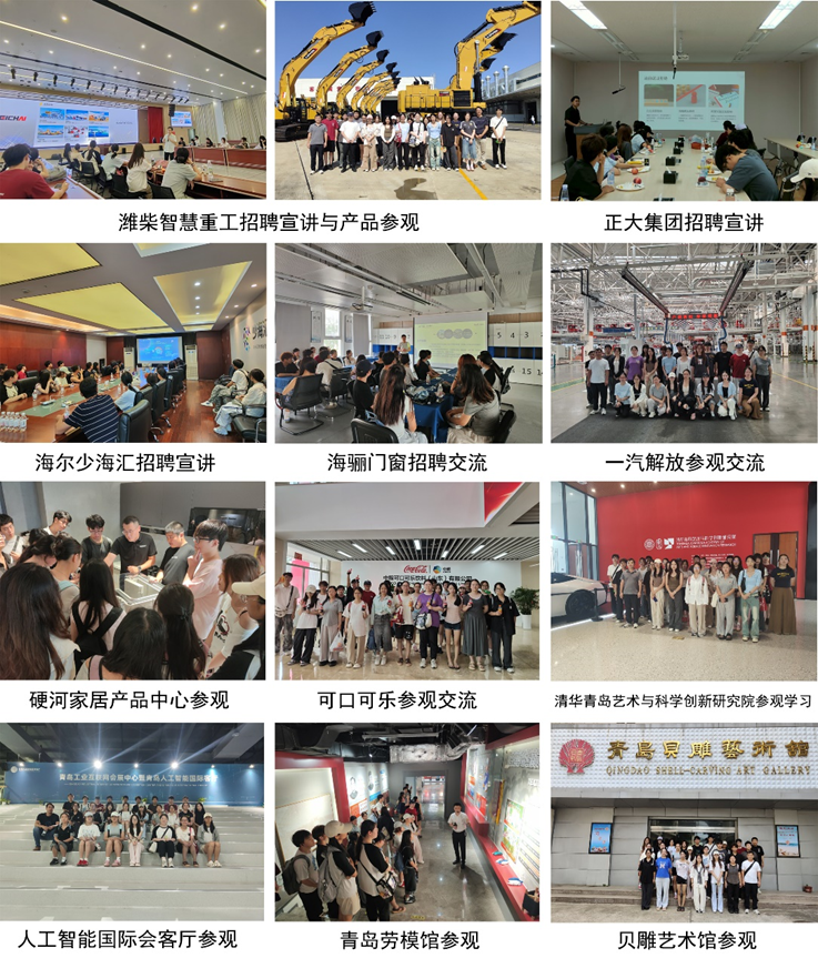 在潍柴青岛智慧重工,同学们深入加工车间,观摩工程机械从零部件设计到组装的完整流程,并参与企业举办的专场招聘宣讲会,详细了解岗位需求与发展路径。正大集团山东安全食品产业园为同学们展示了现代化食品加工流程,人力资源部门负责人就招聘政策、人才培养及薪酬待遇等方面作了系统介绍。在一汽解放有限公司,学生全面了解了商用车制造流程及企业的研发、质保与文化体系。海尔少海汇平台组织学生参观其生态圈企业,包括海骊住居、有屋科技等,并在座谈中深入交流产品设计理念、团队协作模式和人才发展机制,同学们也就工业设计相关岗位的具体内容积极提问、互动交流。