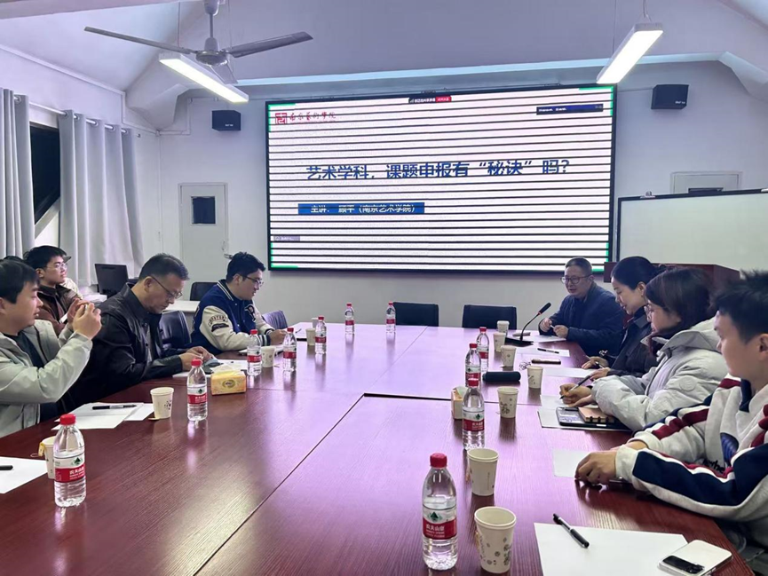 为系统推进2026年度国家基金项目申报工作,有效提升学院特色学科申报书质量,建筑与艺术设计学院于近期启动学术大咖基金申报系列专题辅导报告。10月23日晚7点,系列报告首场在槐园三楼会议室隆重开讲。学院特邀南京艺术学院艺术研究院院长、知名学者顾平教授亲临现场,为学院教师及研究生带来一场题为《艺术学科,课题申报有秘诀吗?》的学术盛宴。报告由学院院长刘奔腾教授主持,现场座无虚席,线上线下共计百余名师生参与。