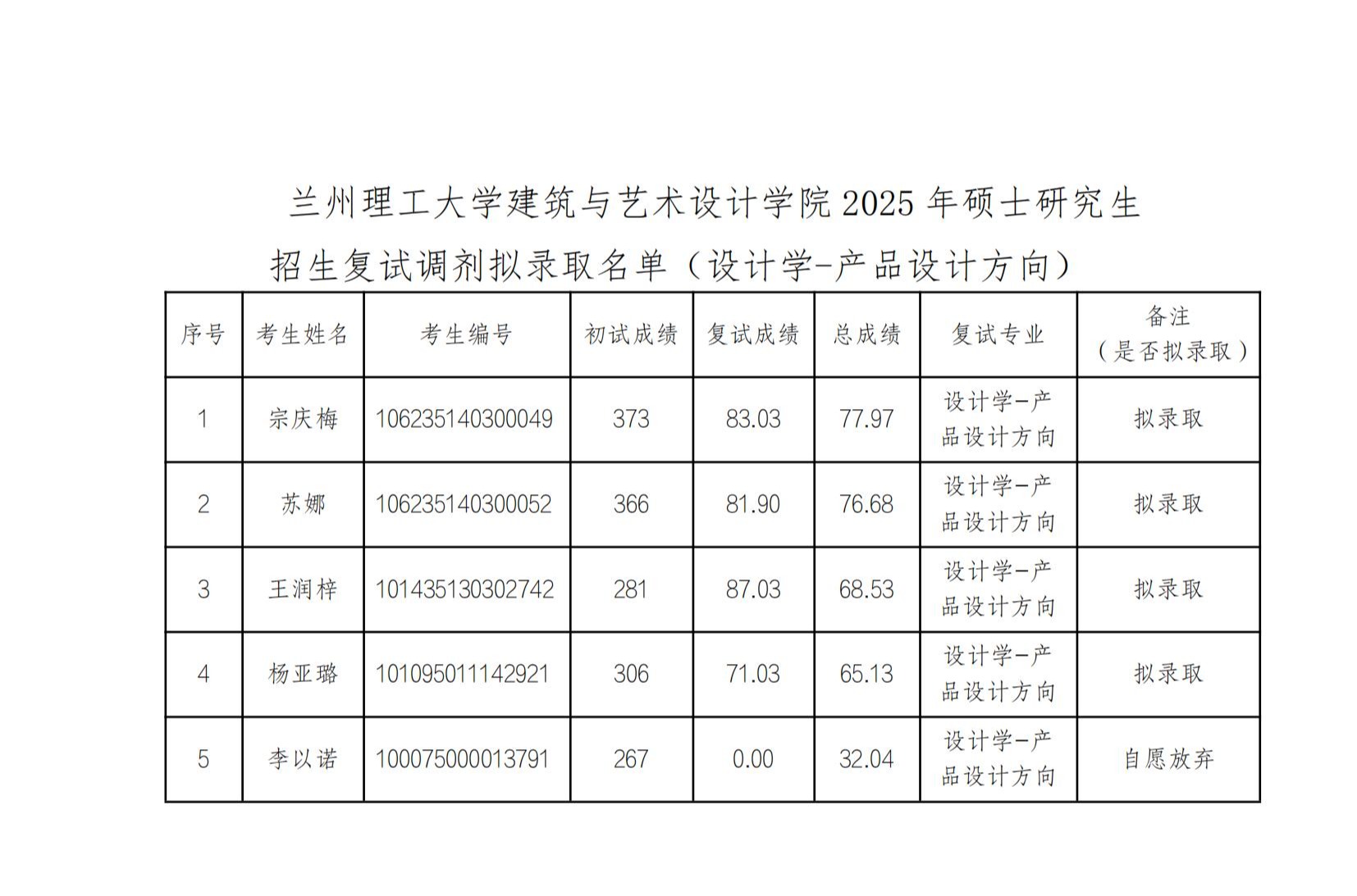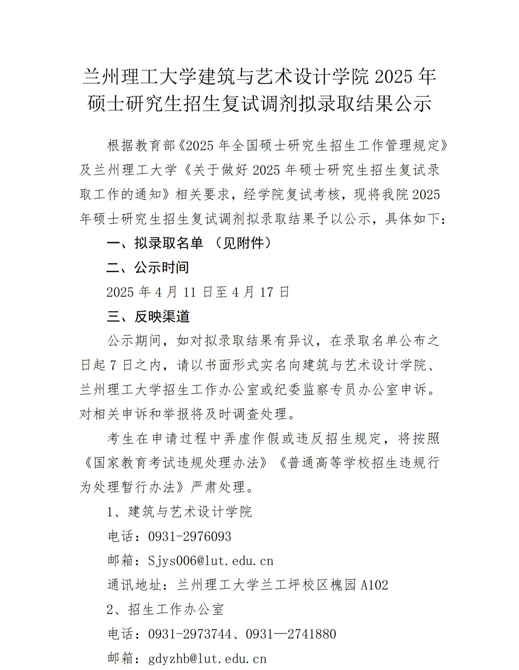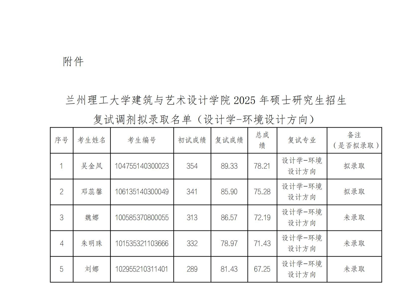 兰州理工大学建筑与艺术设计学院2025年硕士研究生招生复试调剂拟录取结果公示