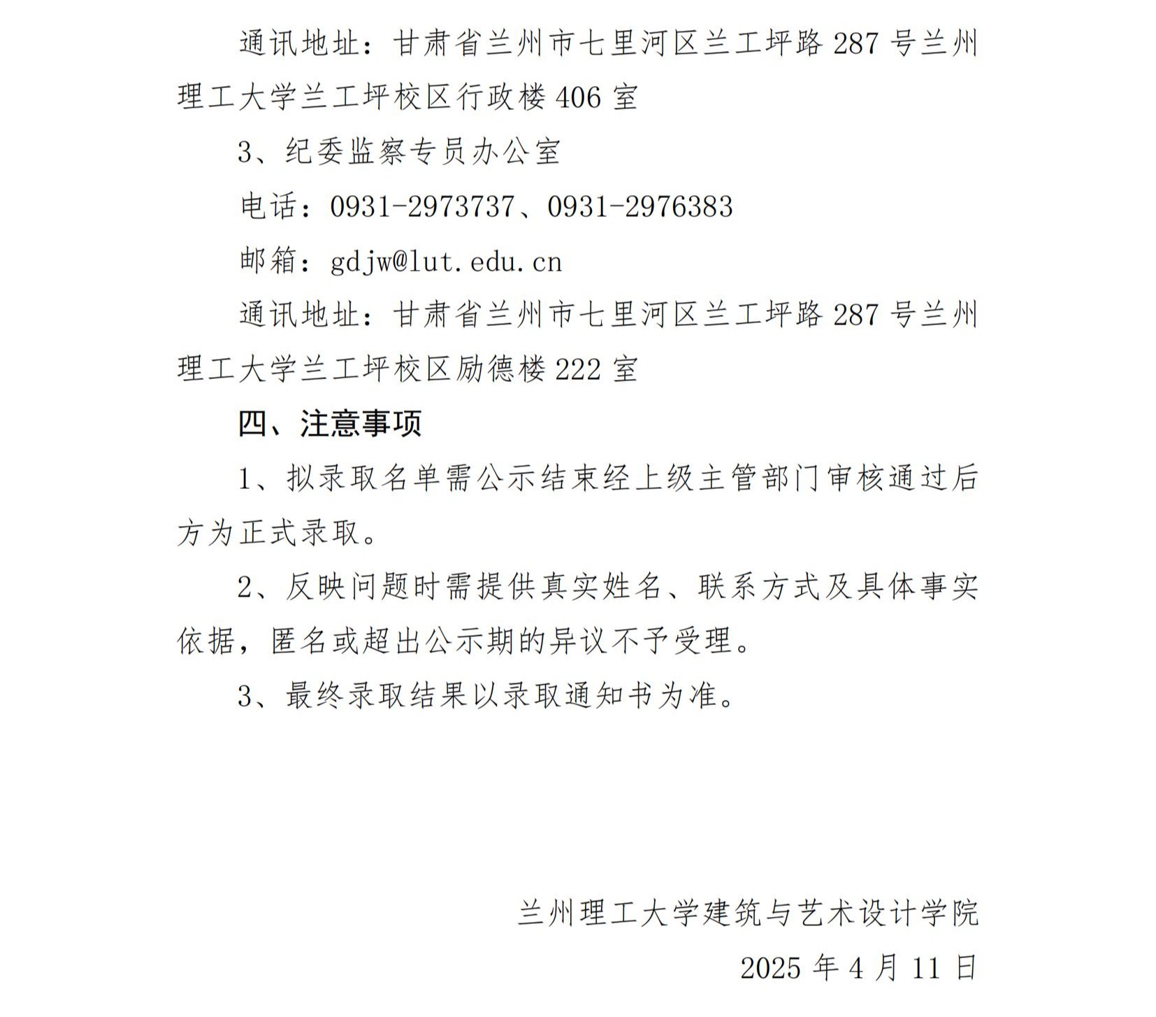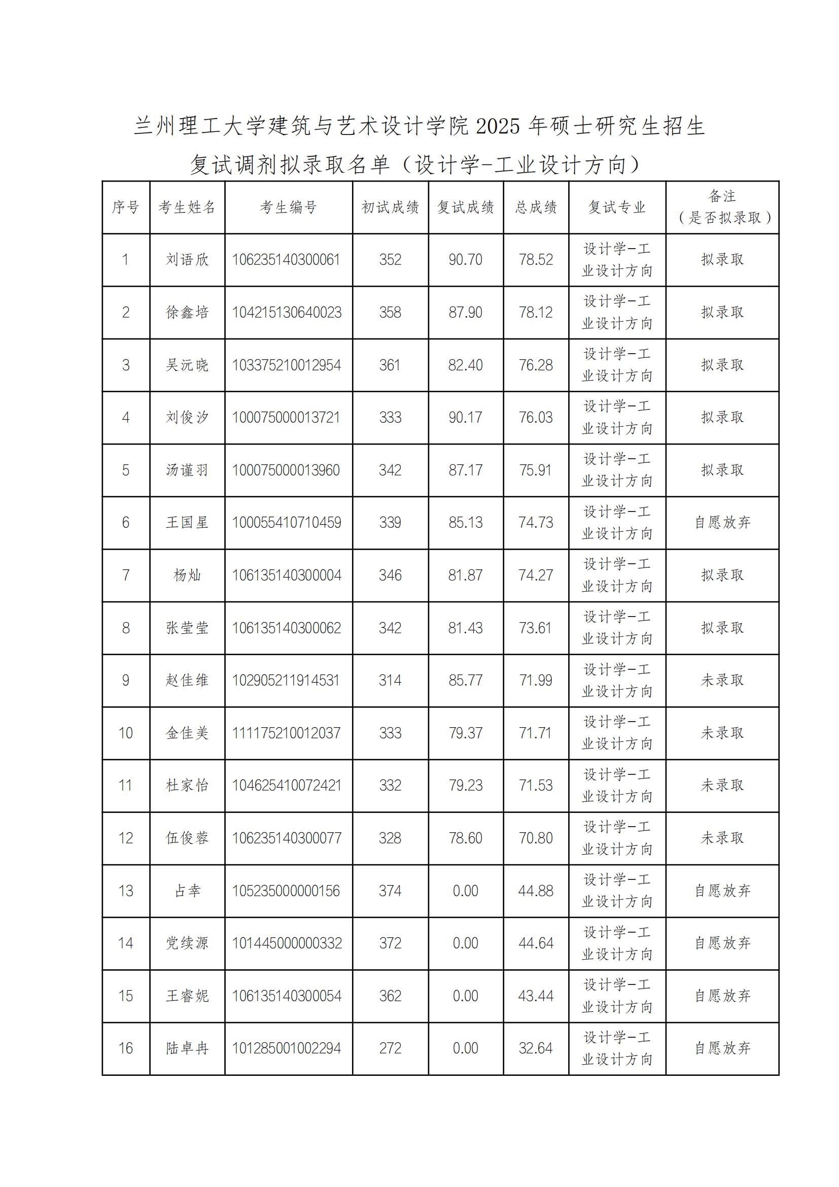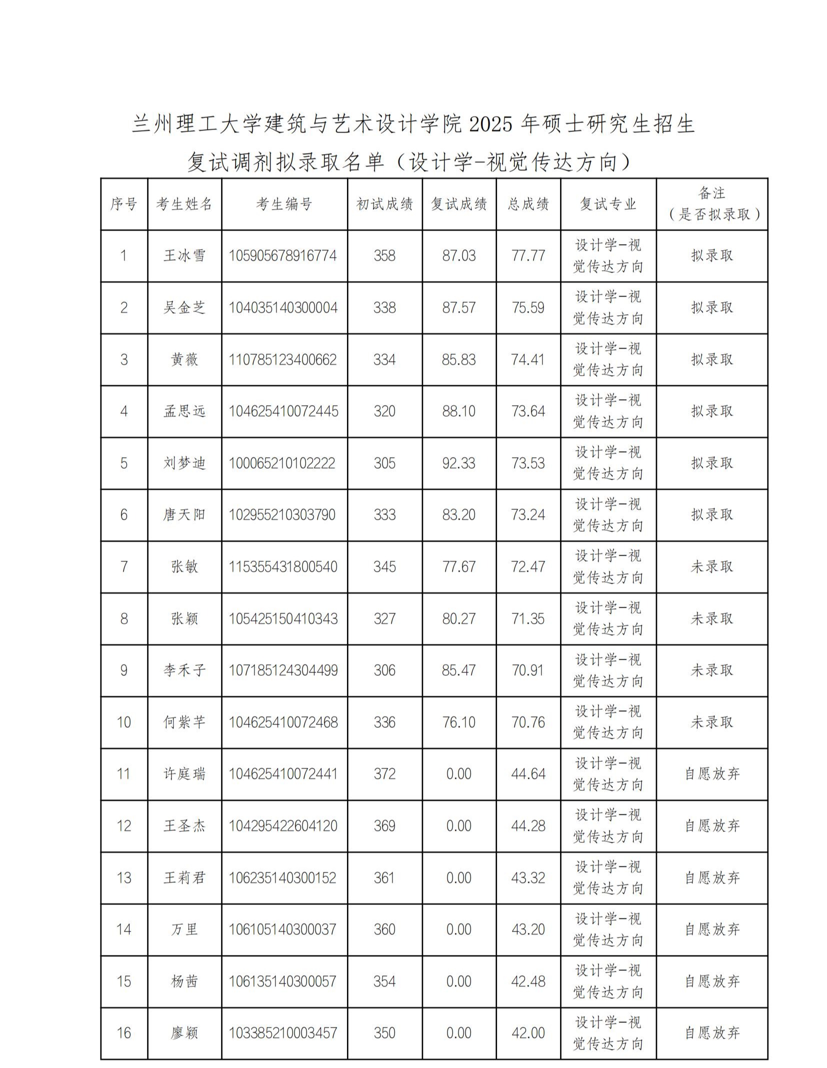 兰州理工大学建筑与艺术设计学院2025年硕士研究生招生复试调剂拟录取结果公示