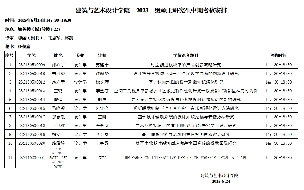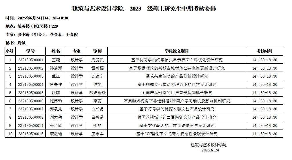 建筑与艺术设计学院硕士研究生中期考核安排 设计学共2组