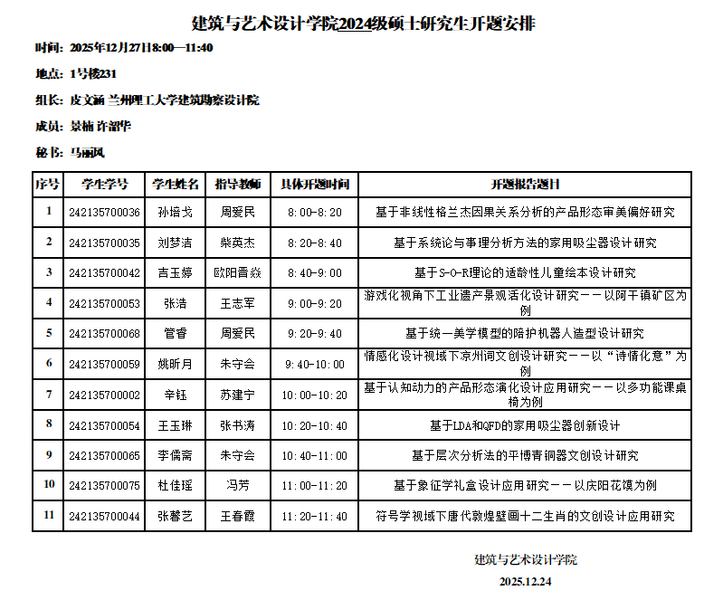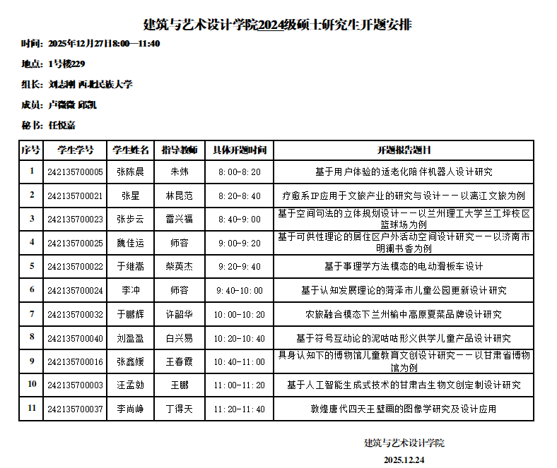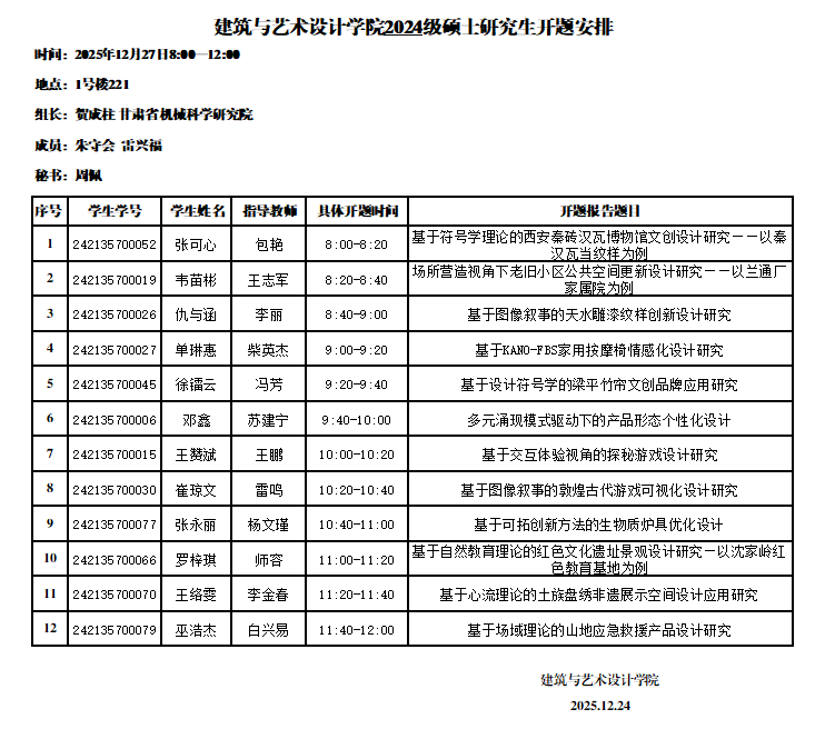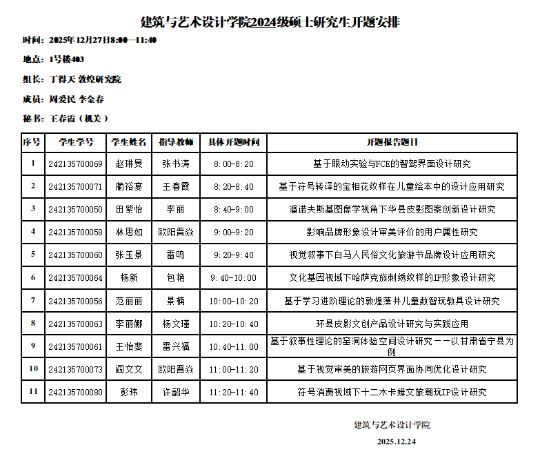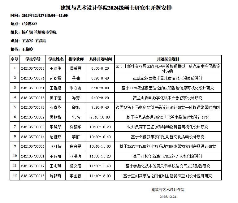 建筑与艺术设计学院2024级硕士研究生开题安排(设计5组)